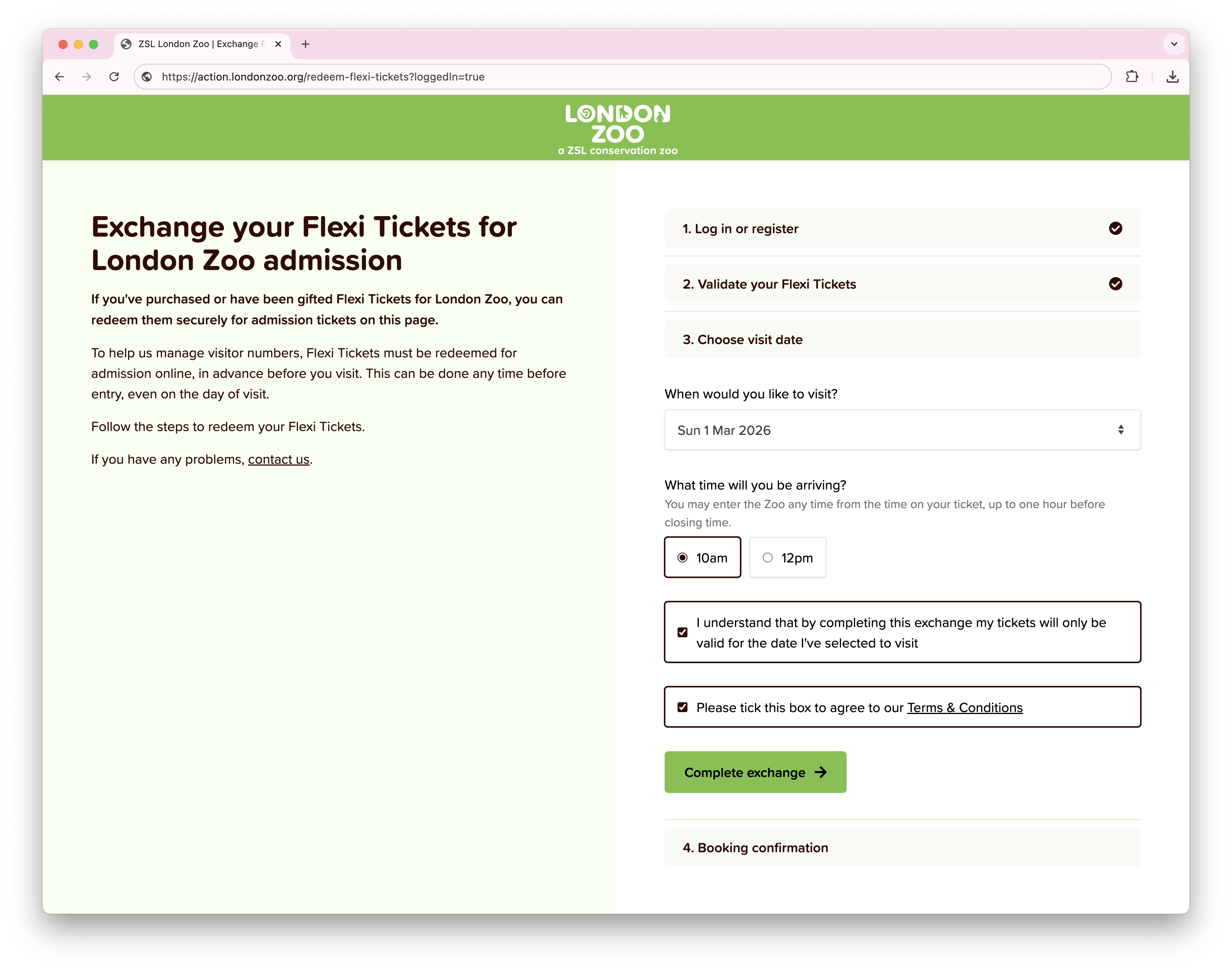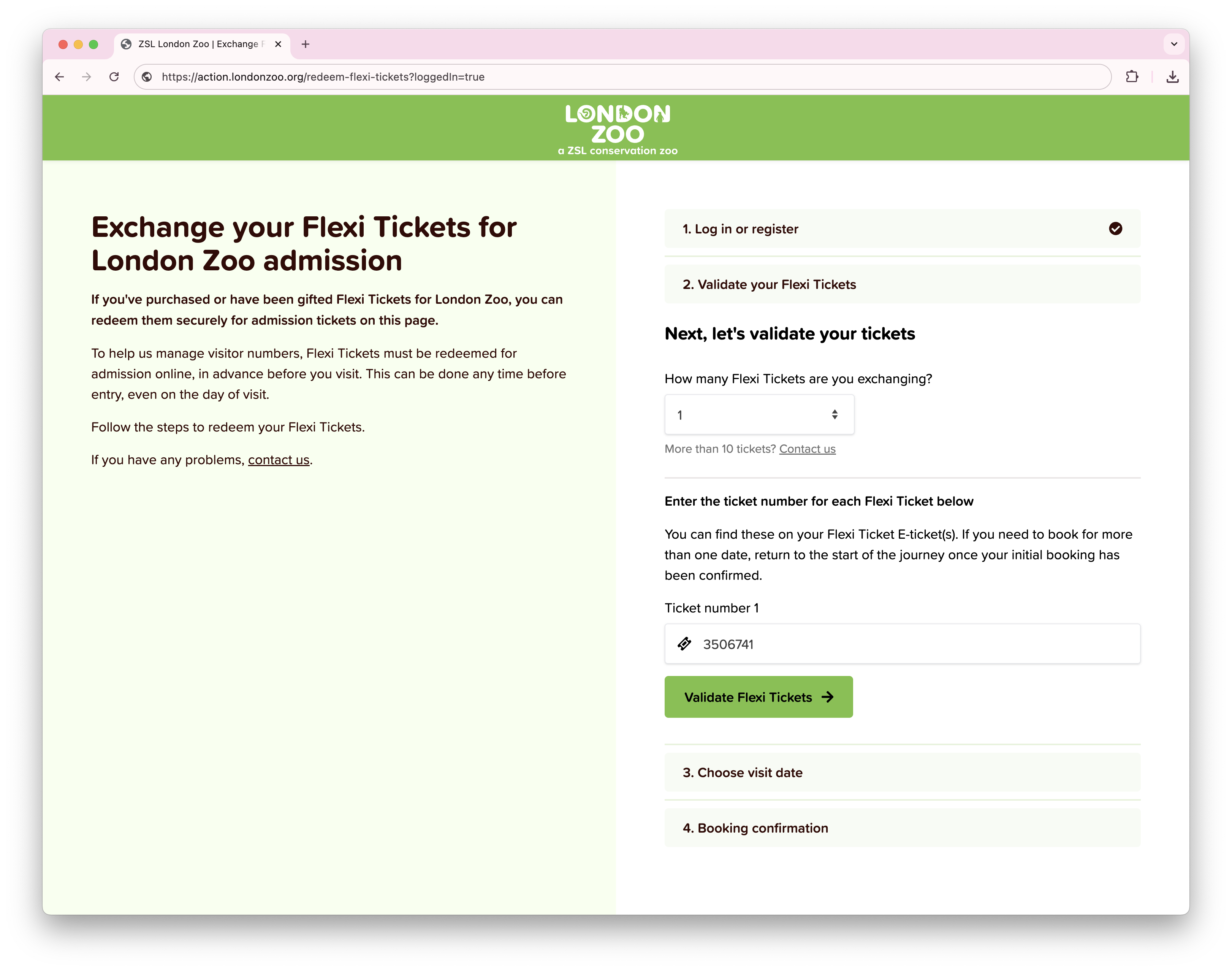 The first thing we needed to establish was the location we were sending users to in order to redeem a Flexi-Ticket. Because ZSL has two websites - one for London Zoo and one for Whipsnade Zoo - we set up two separate Action Links subdomains and added the respective zoo logos, colour and font styles to each. This meant we had two distinct environments for users depending on which zoo they were visiting.