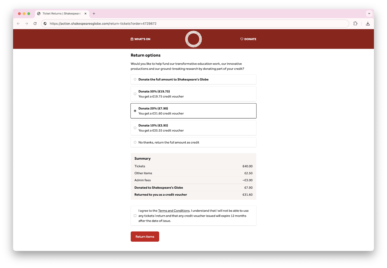 However, issuing returns via the Box Office phone lines was consuming up to 60 days of staff time every year. With 80% of the Globe’s audiences being online bookers who therefore expect an end-to-end digital experience through all touchpoints of their engagement, an online returns service was needed that was hands-off for staff and cut down the amount of returns needing to be processed by the Box Office.